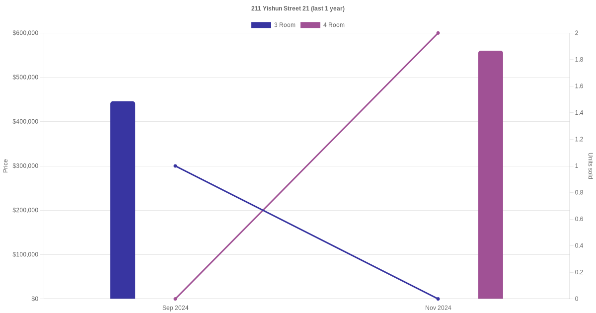 Below is a quick summary of the resale transactions volume and average price trends for the 3 room and 4 room units at 211 Yishun Street 21.