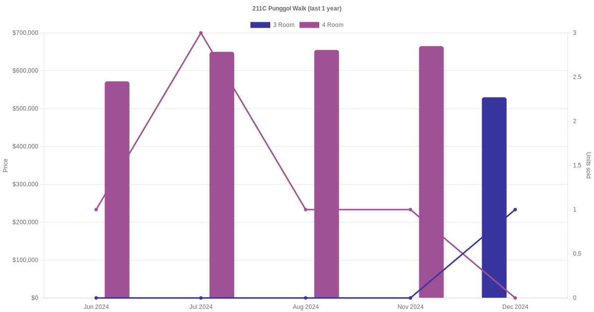 Below is a quick summary of the resale transactions volume and average price trends for the 3 room and 4 room units at 211C Punggol Walk.