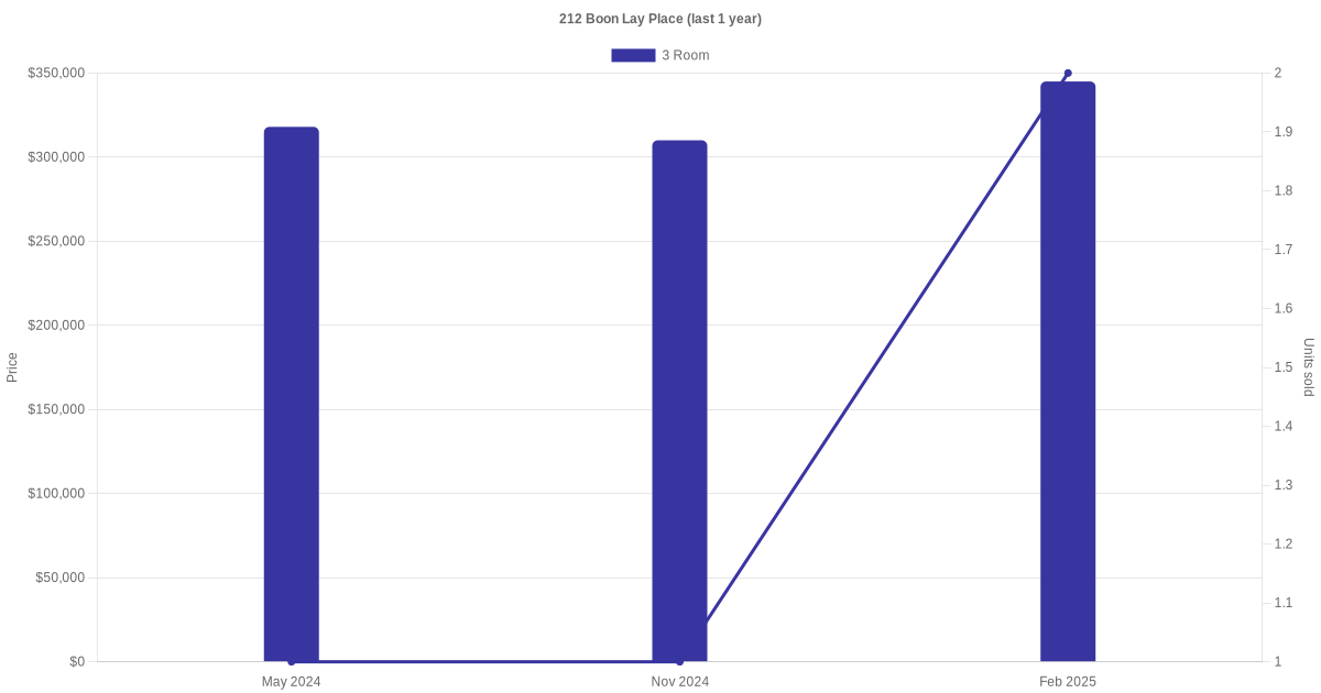 Below is a quick summary of the resale transactions volume and average price trends for the 3 room units at 212 Boon Lay Place.