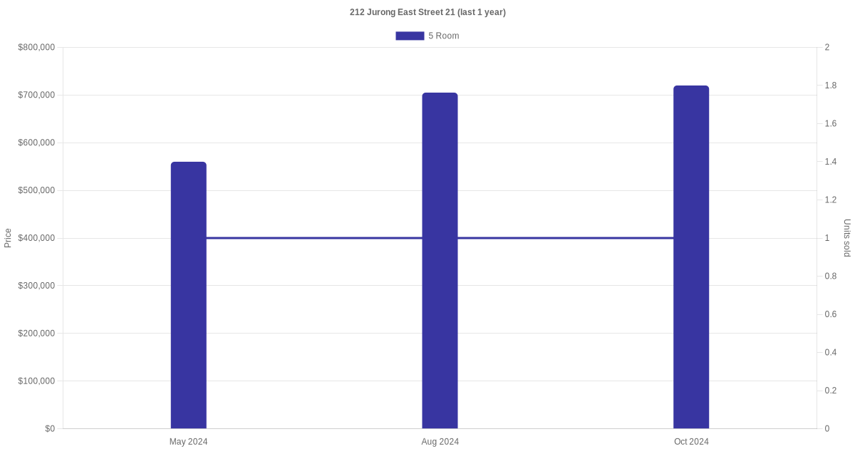 Below is a quick summary of the resale transactions volume and average price trends for the 5 room units at 212 Jurong East Street 21.