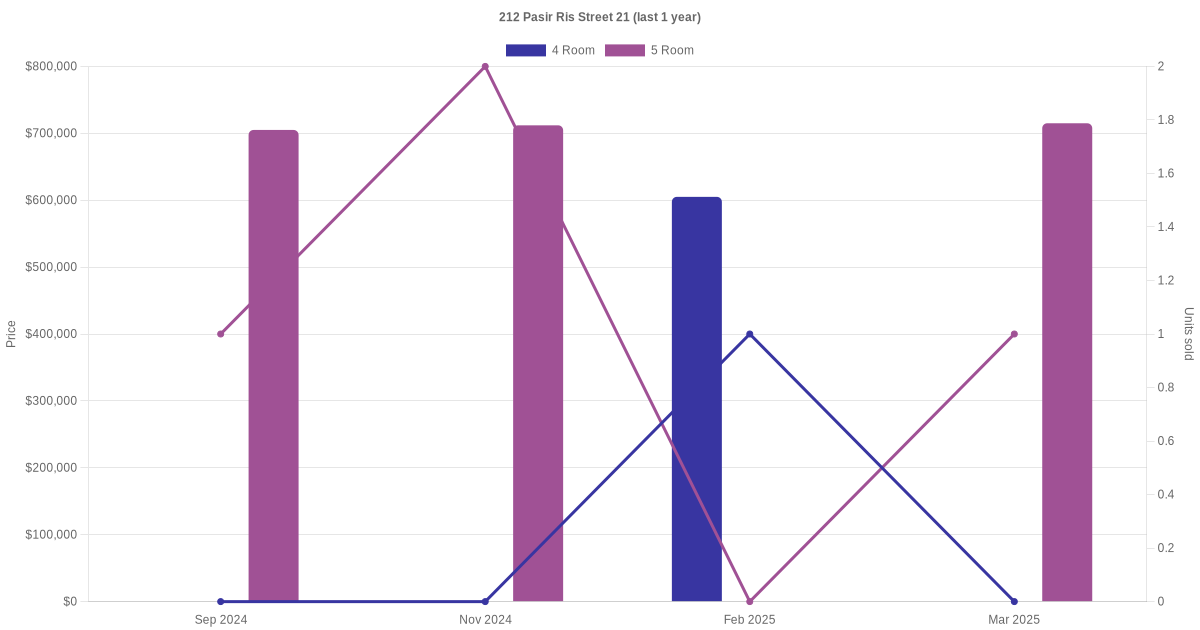 Below is a quick summary of the resale transactions volume and average price trends for the 4 room and 5 room units at 212 Pasir Ris Street 21.