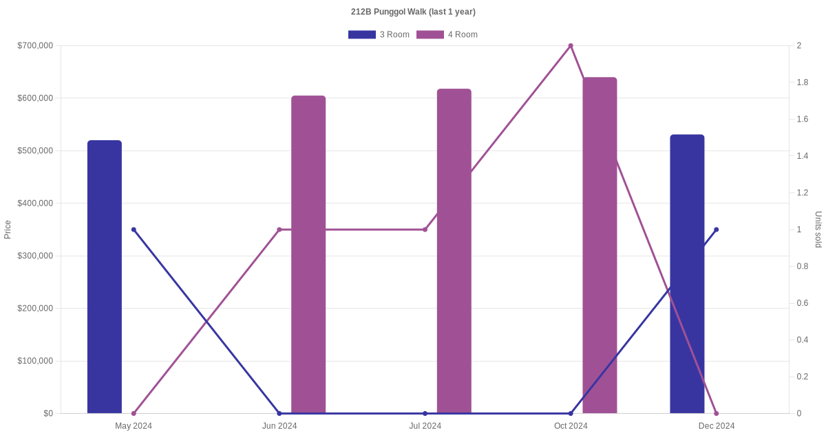 Below is a quick summary of the resale transactions volume and average price trends for the 3 room and 4 room units at 212B Punggol Walk.