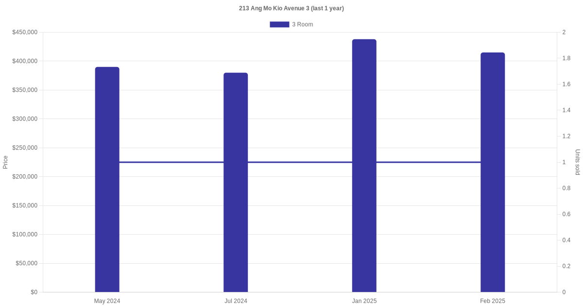 | Feb 2025 | $2,400 | 3 Room | Blk 213 Ang Mo Kio Avenue 3 3 Room | Ang Mo Kio |