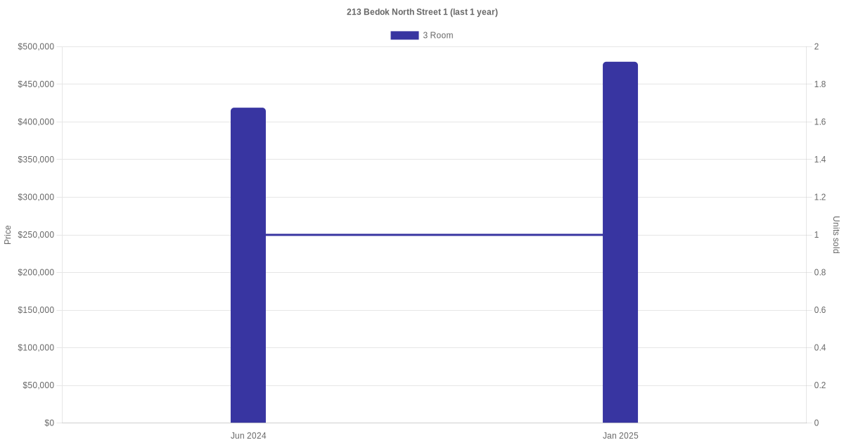 There were a total of 6 resale transactions in the last 3 years for units in block 213 Bedok North Street 1, with the latest one recorded in Dec 2025.