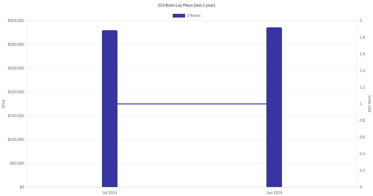 Below is a quick summary of the resale transactions volume and average price trends for the 3 room units at 213 Boon Lay Place.