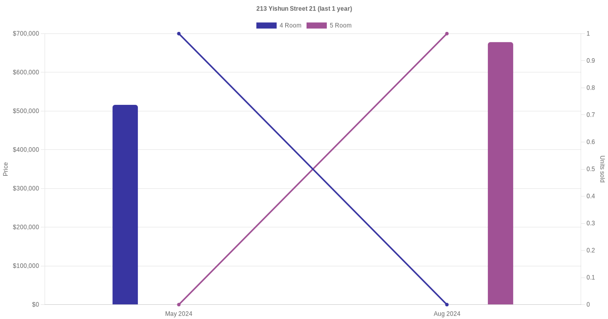 Below is a quick summary of the resale transactions volume and average price trends for the 4 room and 5 room units at 213 Yishun Street 21.