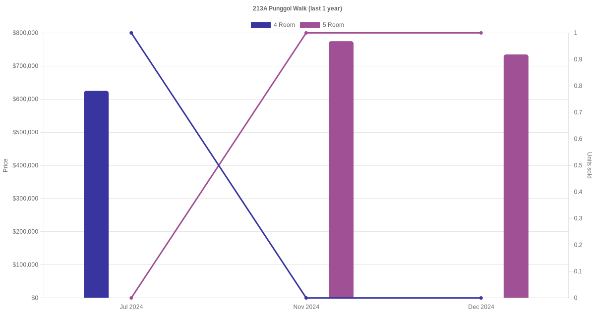 Below is a quick summary of the resale transactions volume and average price trends for the 4 room and 5 room units at 213A Punggol Walk.