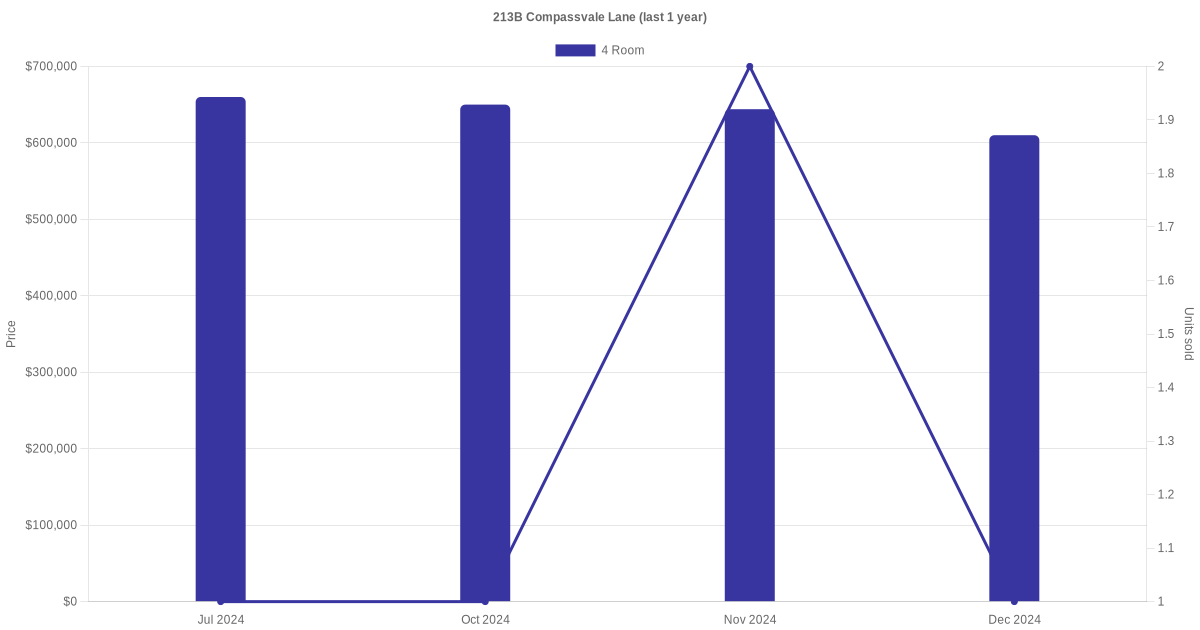 Below is a quick summary of the resale transactions volume and average price trends for the 4 room units at 213B Compassvale Lane.