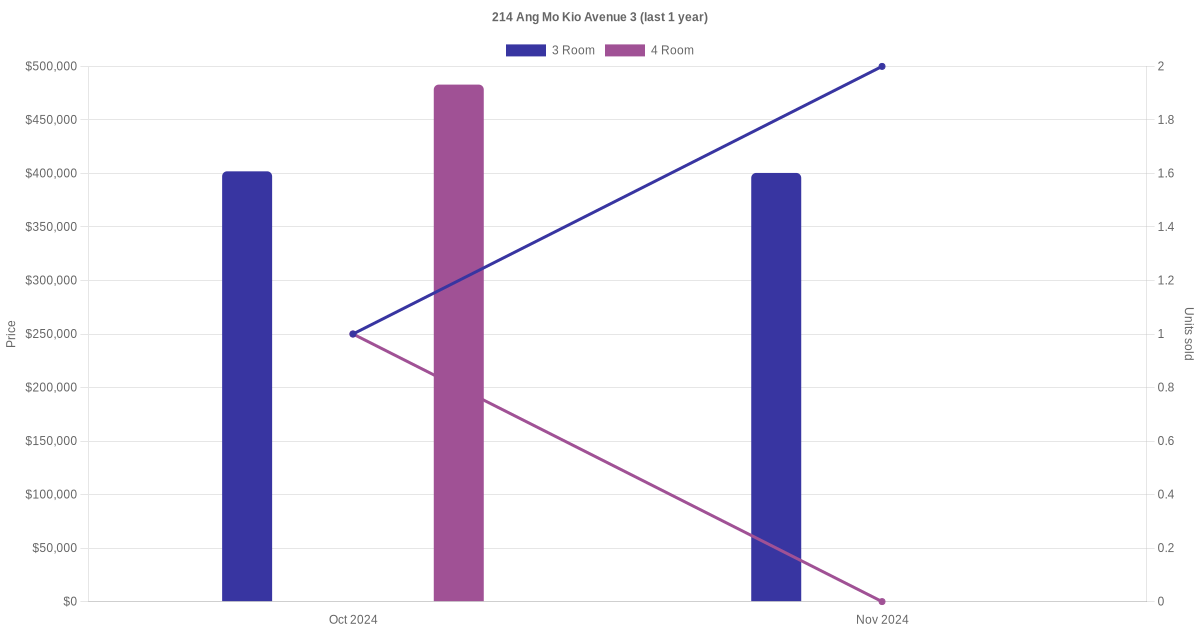 | Nov 2024 | $2,100 | 3 Room | Blk 214 Ang Mo Kio Avenue 3 3 Room | Ang Mo Kio |