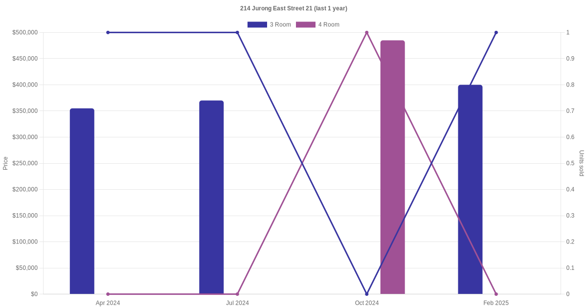 Below is a quick summary of the resale transactions volume and average price trends for the 3 room and 4 room units at 214 Jurong East Street 21.