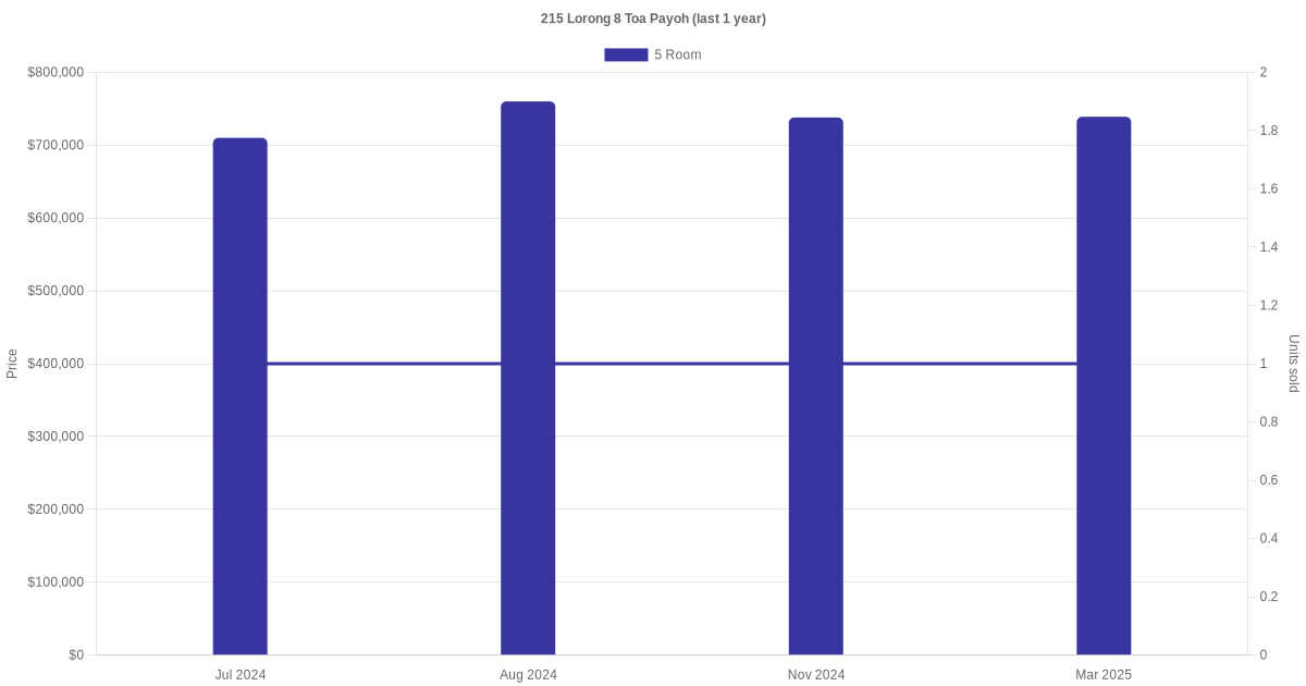 There were a total of 7 resale transactions in the last 3 years for units in block 215 Lorong 8 Toa Payoh, with the latest one recorded in Jul 2025.