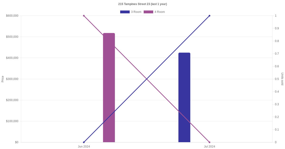 Below is a quick summary of the resale transactions volume and average price trends for the 3 room and 4 room units at 215 Tampines Street 23.