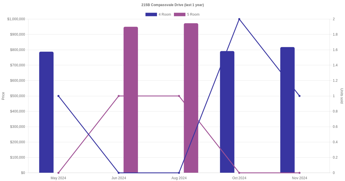 Below is a quick summary of the resale transactions volume and average price trends for the 4 room and 5 room units at 215B Compassvale Drive.