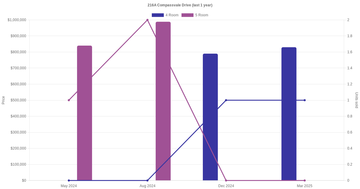 Below is a quick summary of the resale transactions volume and average price trends for the 4 room and 5 room units at 216A Compassvale Drive.