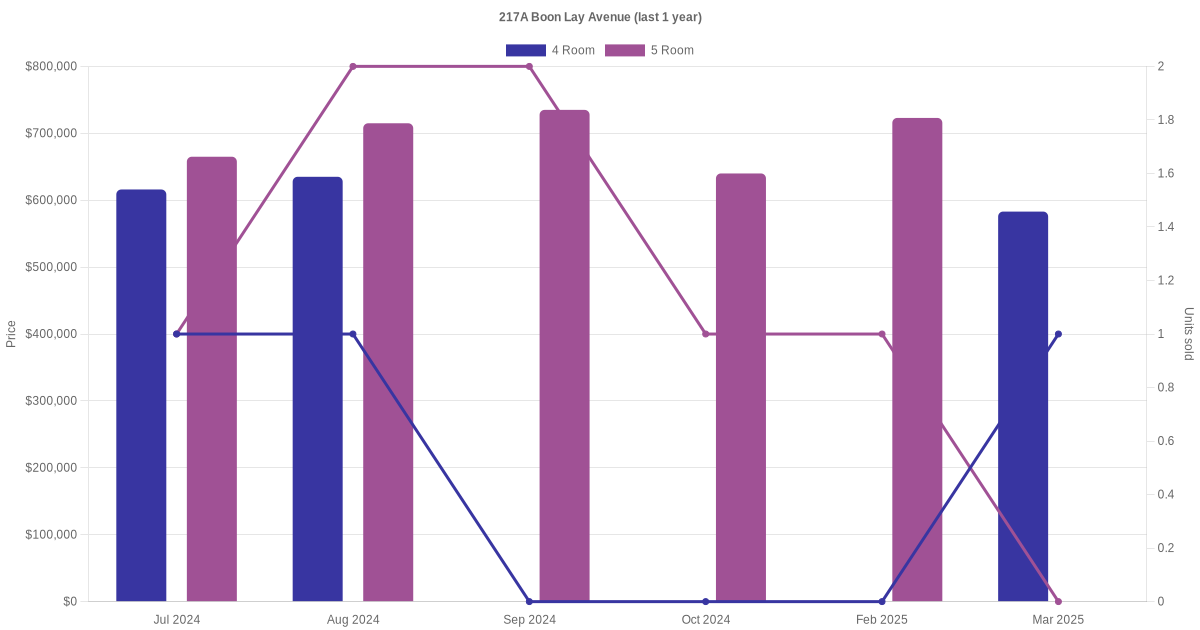 Below is a quick summary of the resale transactions volume and average price trends for the 4 room and 5 room units at 217A Boon Lay Avenue.