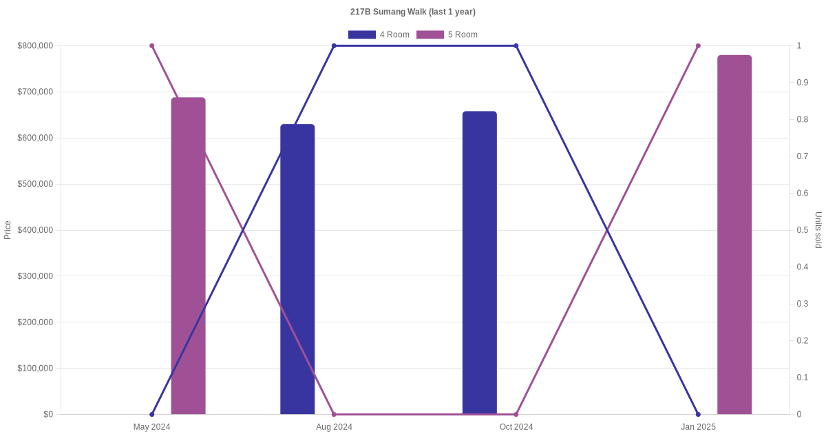Below is a quick summary of the resale transactions volume and average price trends for the 4 room and 5 room units at 217B Sumang Walk.