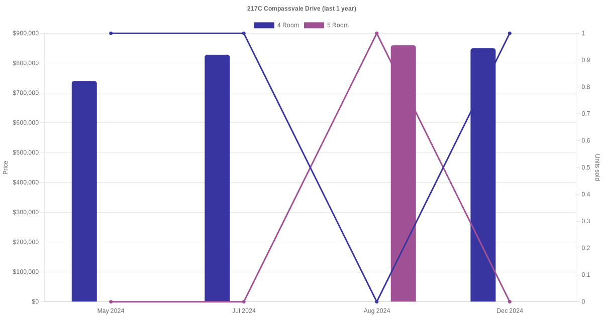 Below is a quick summary of the resale transactions volume and average price trends for the 4 room and 5 room units at 217C Compassvale Drive.