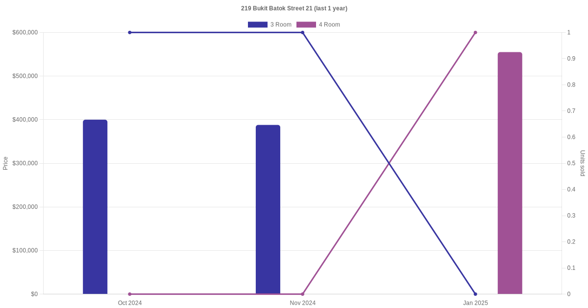 Below is a quick summary of the resale transactions volume and average price trends for the 3 room and 4 room units at 219 Bukit Batok Street 21.