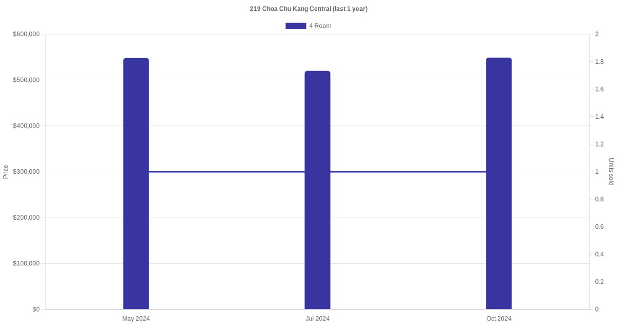 Below is a quick summary of the resale transactions volume and average price trends for the 4 room units at 219 Choa Chu Kang Central.