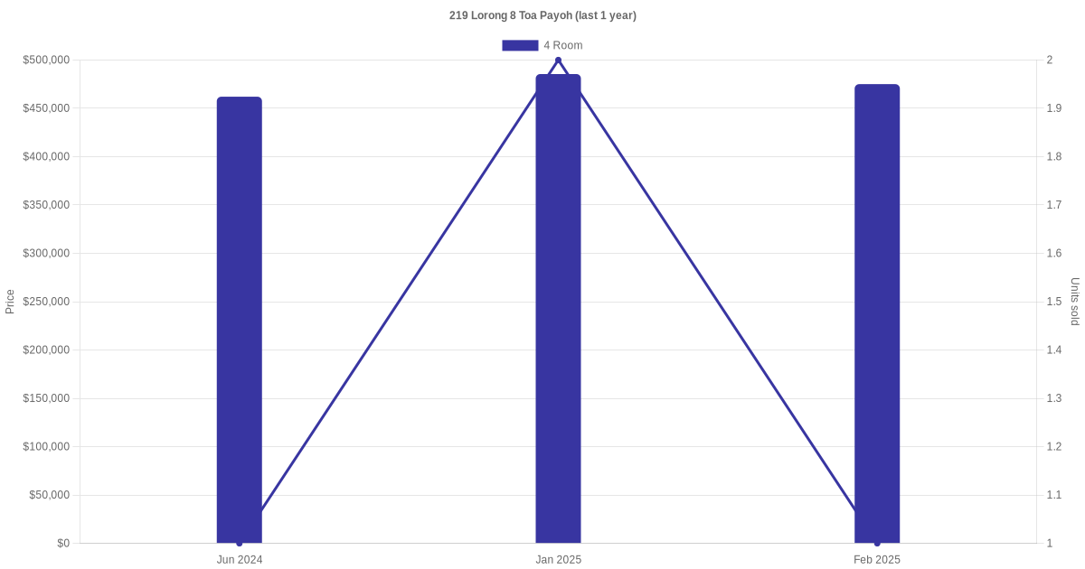 | Mar 2025 | $3,000 | 4 Room | Blk 219 Lorong 8 Toa Payoh 4 Room | Toa Payoh |