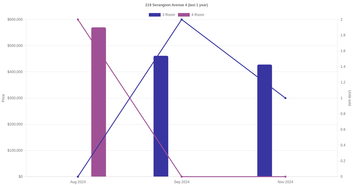 Below is a quick summary of the resale transactions volume and average price trends for the 3 room and 4 room units at 219 Serangoon Avenue 4.