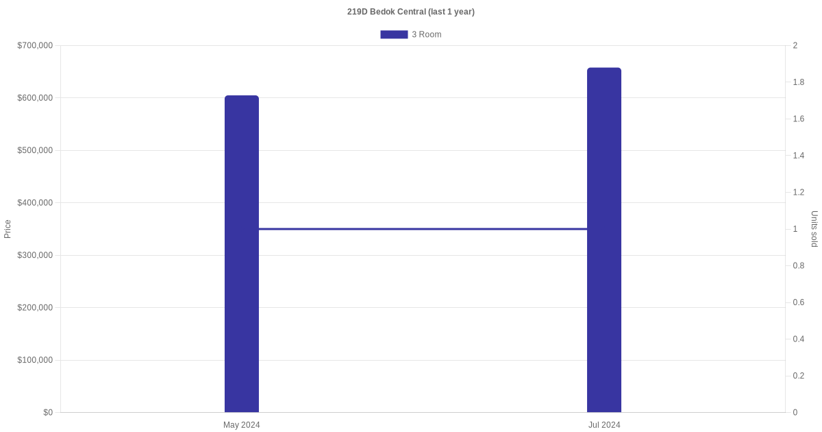 Below is a quick summary of the resale transactions volume and average price trends for the 3 room and 4 room units at 219D Bedok Central.