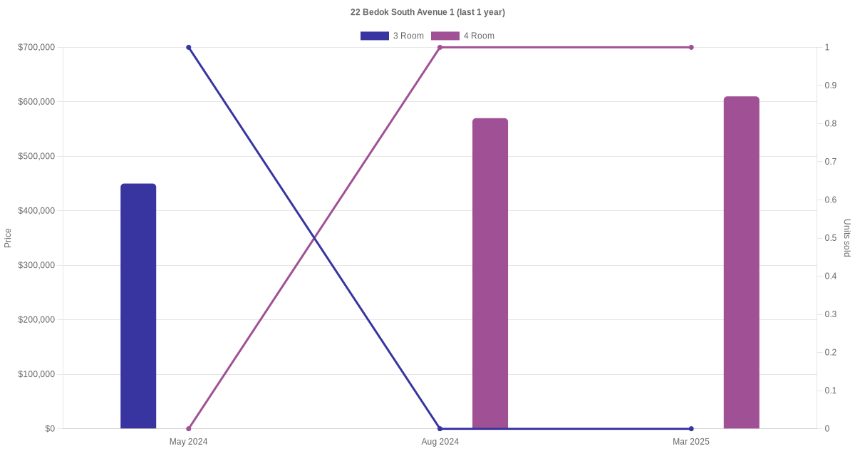 Below is a quick summary of the resale transactions volume and average price trends for the 3 room and 4 room units at 22 Bedok South Avenue 1.