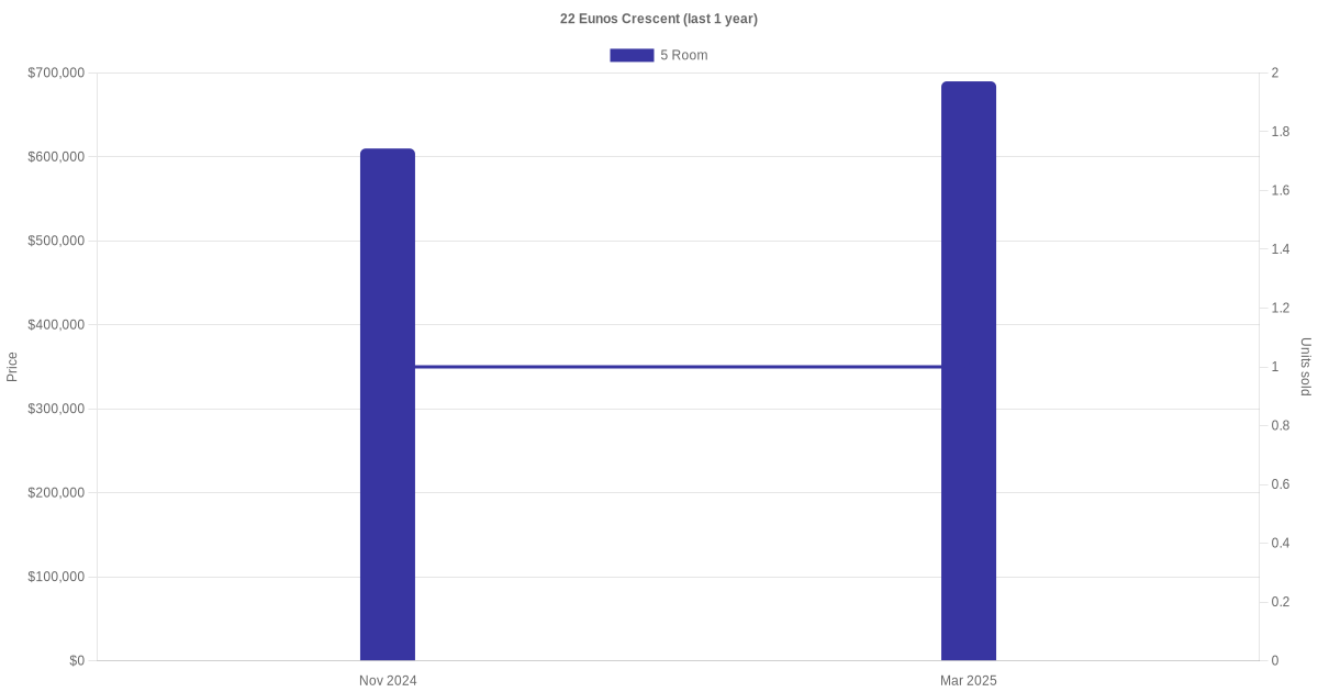 | Mar 2025 | $690,000 | $5,610 | 5 Room | Blk 22 Eunos Crescent 5 Room / 123 sqm | 16 to 18 | 123 sqm | Standard | 1977 |