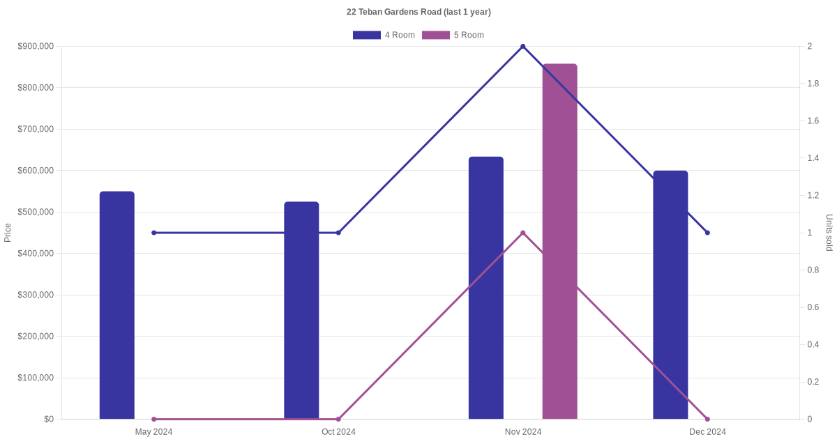 Below is a quick summary of the resale transactions volume and average price trends for the 4 room and 5 room units at 22 Teban Gardens Road.
