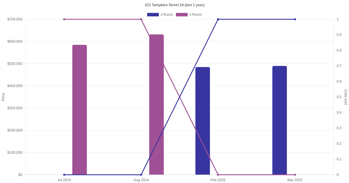 Below is a quick summary of the resale transactions volume and average price trends for the 3 room and 4 room units at 221 Tampines Street 24.
