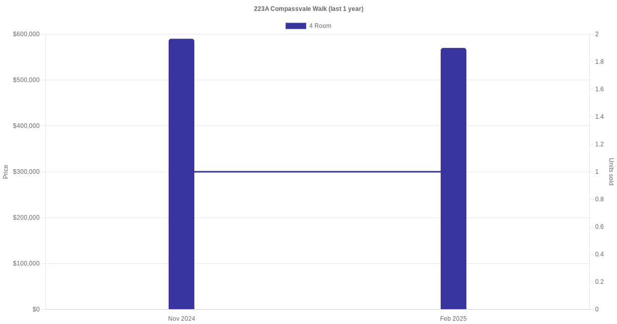 Below is a quick summary of the resale transactions volume and average price trends for the 4 room units at 223A Compassvale Walk.