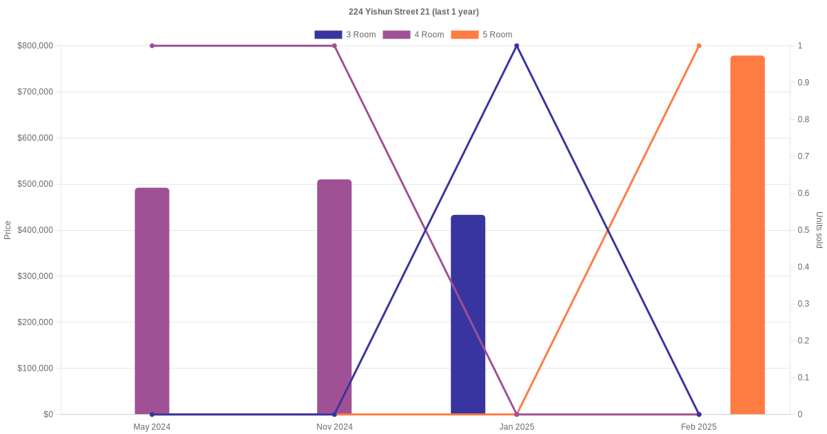 Below is a quick summary of the resale transactions volume and average price trends for the 3 room, 4 room and 5 room units at 224 Yishun Street 21.