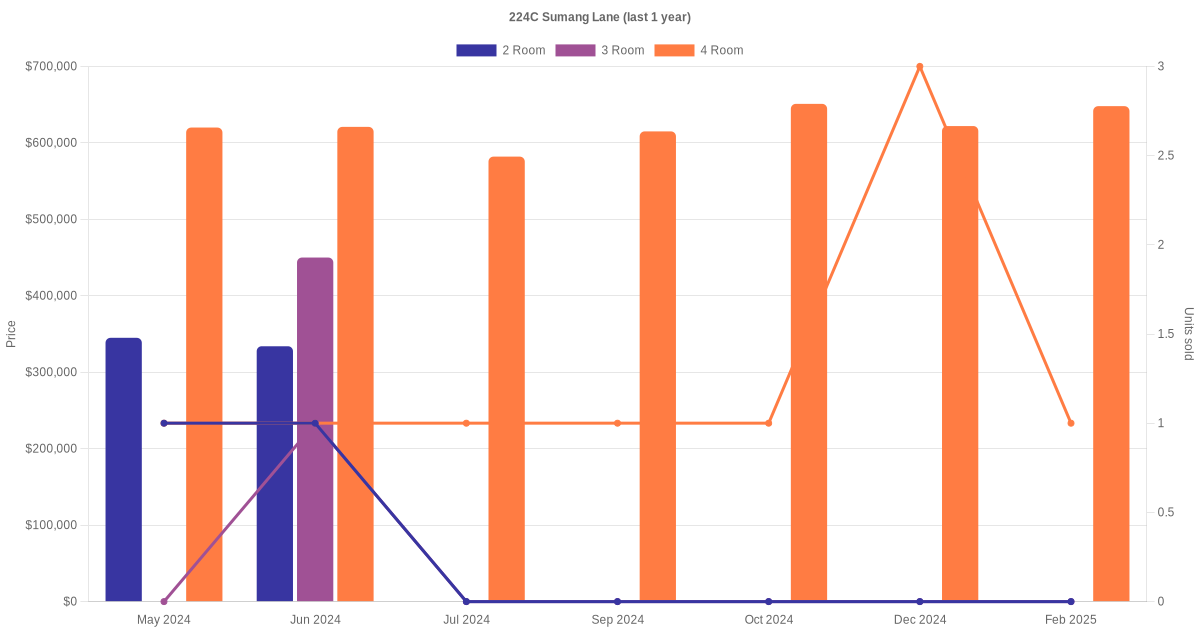 Here's a summary of the rental transactions and price trends for the 2 room, 3 room and 4 room units at 224C Sumang Lane.