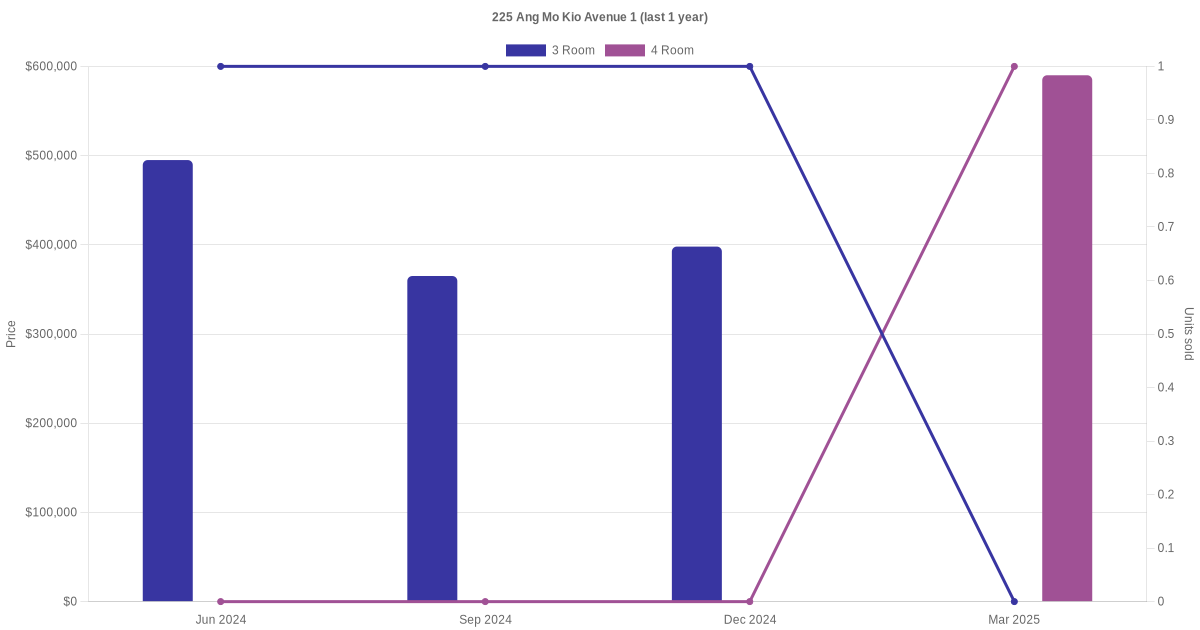 Below is a quick summary of the resale transactions volume and average price trends for the 3 room and 4 room units at 225 Ang Mo Kio Avenue 1.