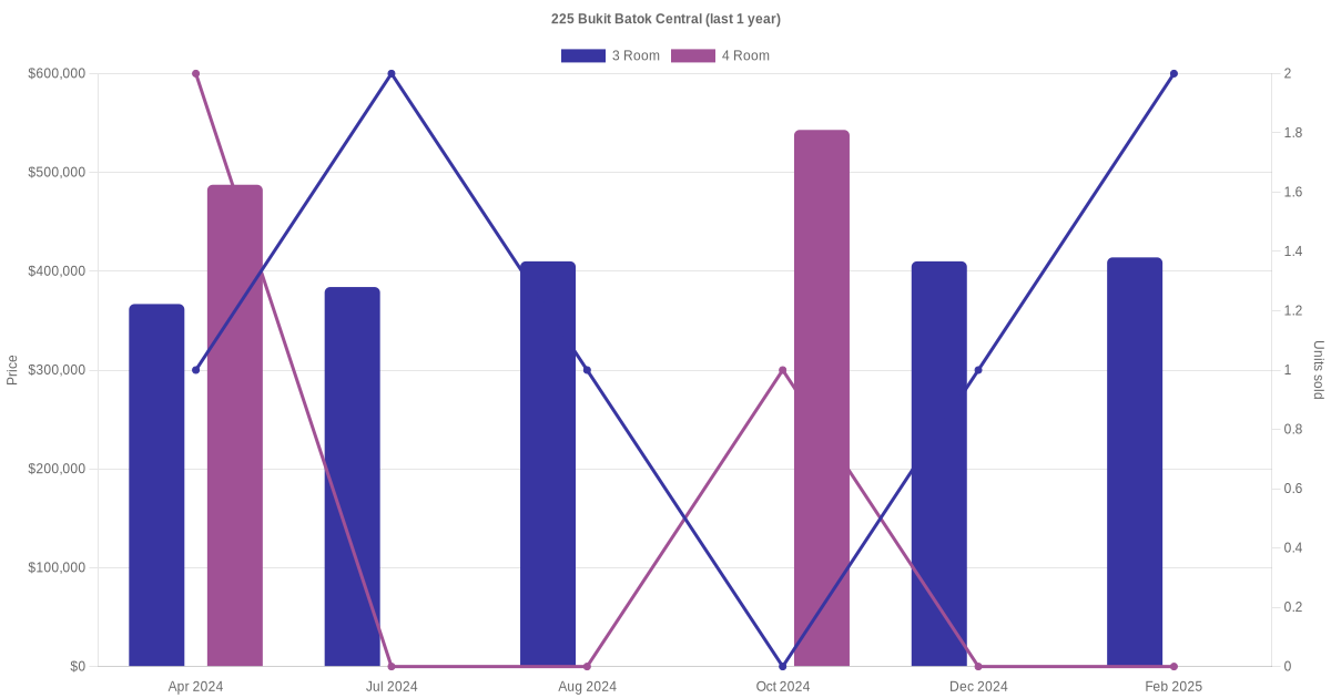 Below is a quick summary of the resale transactions volume and average price trends for the 3 room and 4 room units at 225 Bukit Batok Central.