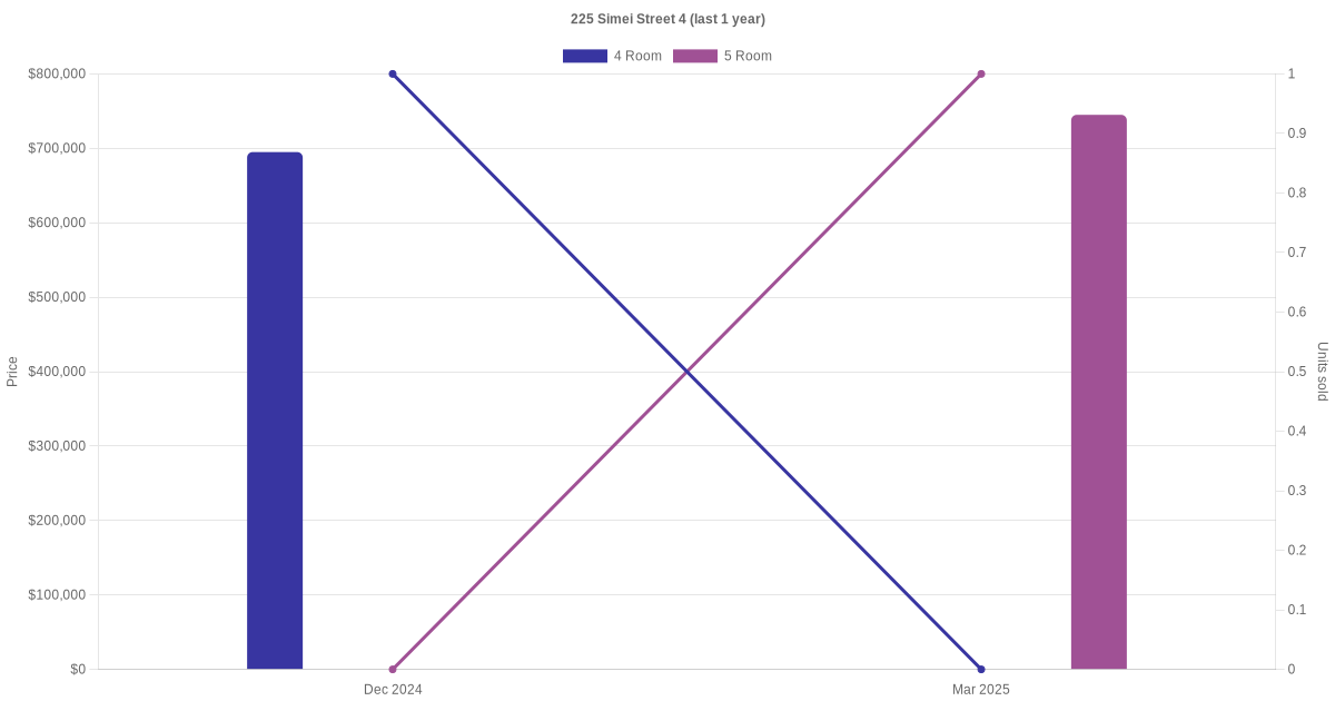 Below is a quick summary of the resale transactions volume and average price trends for the 4 room and 5 room units at 225 Simei Street 4.