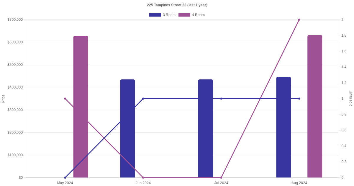 Below is a quick summary of the resale transactions volume and average price trends for the 3 room and 4 room units at 225 Tampines Street 23.
