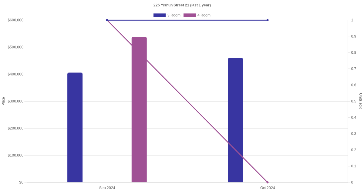 There were a total of 11 resale transactions in the last 3 years for units in block 225 Yishun Street 21, with the latest one recorded in Sep 2025.