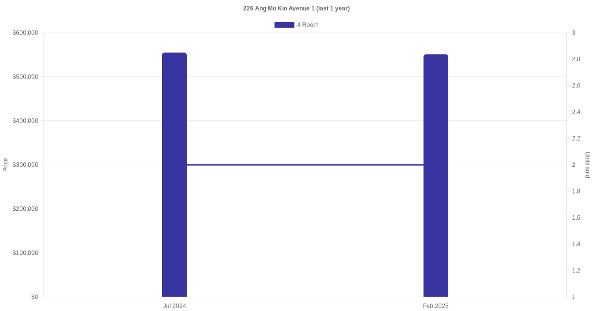 Below is a quick summary of the resale transactions volume and average price trends for the 4 room units at 226 Ang Mo Kio Avenue 1.