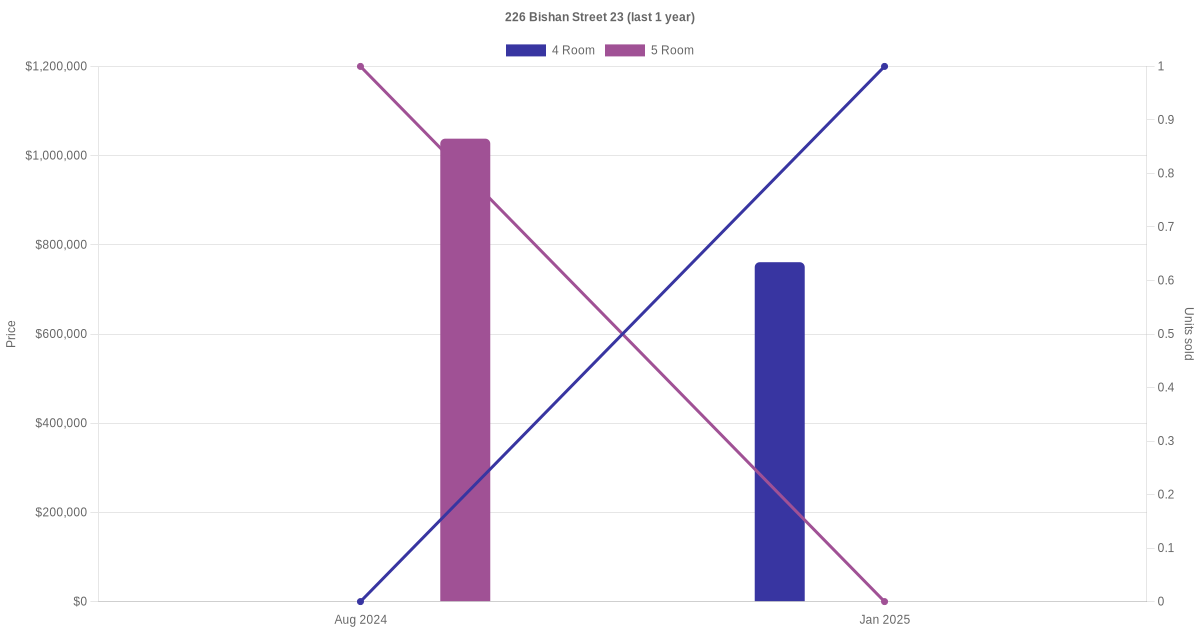 Below is a quick summary of the resale transactions volume and average price trends for the 4 room and 5 room units at 226 Bishan Street 23.