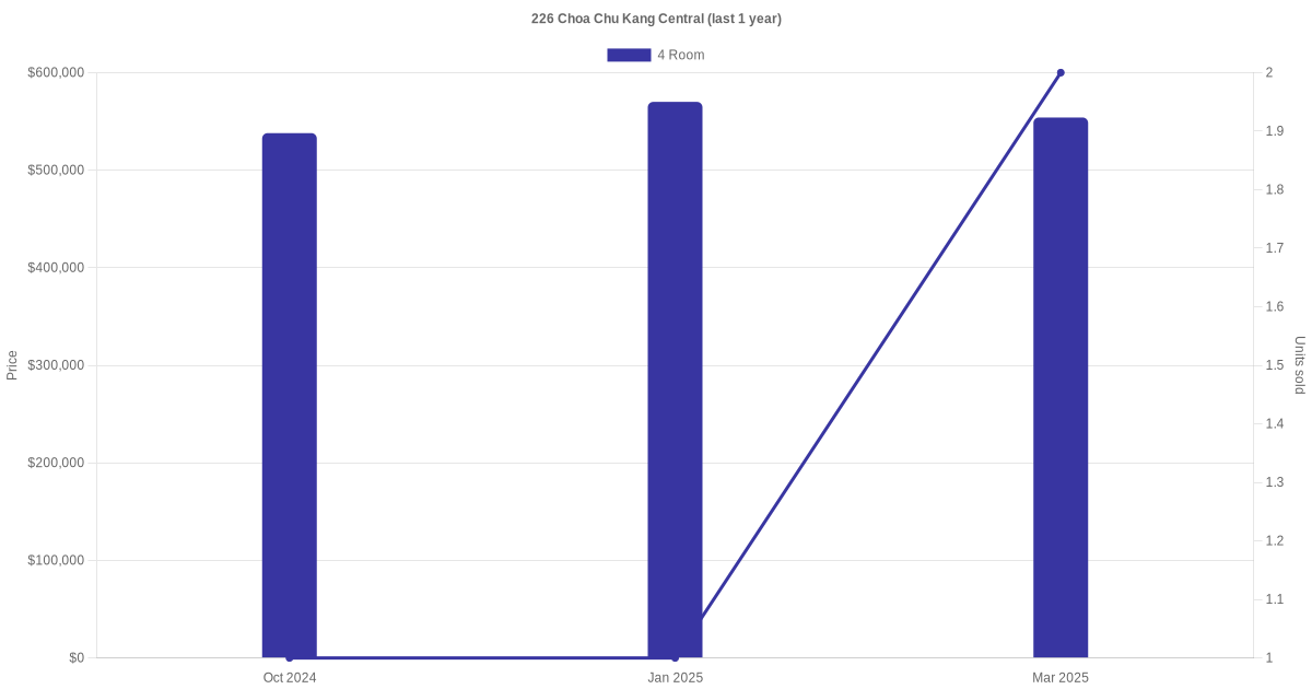 There were a total of 9 resale transactions in the last 3 years for units in block 226 Choa Chu Kang Central, with the latest one recorded in Mar 2025.