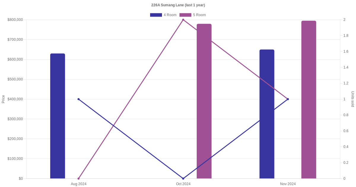 Below is a quick summary of the resale transactions volume and average price trends for the 4 room and 5 room units at 226A Sumang Lane.