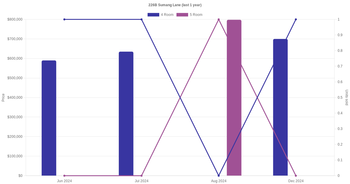Below is a quick summary of the resale transactions volume and average price trends for the 4 room and 5 room units at 226B Sumang Lane.