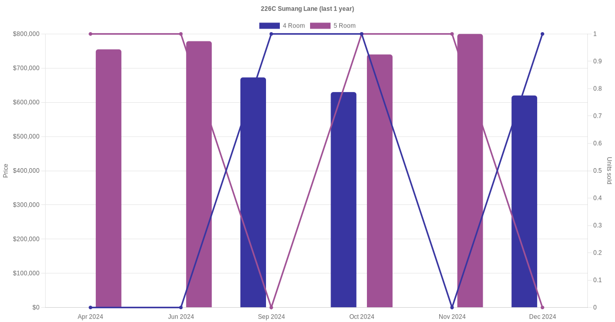 Below is a quick summary of the resale transactions volume and average price trends for the 4 room and 5 room units at 226C Sumang Lane.