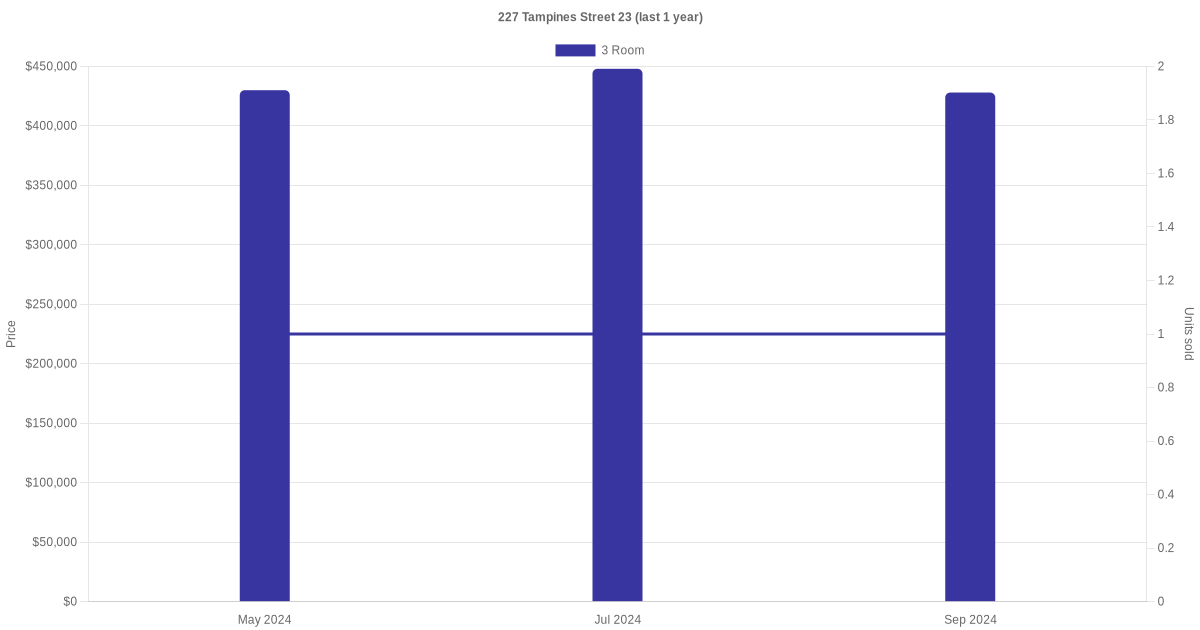 | Dec 2024 | $2,250 | 3 Room | Blk 227 Tampines Street 23 3 Room | Tampines |