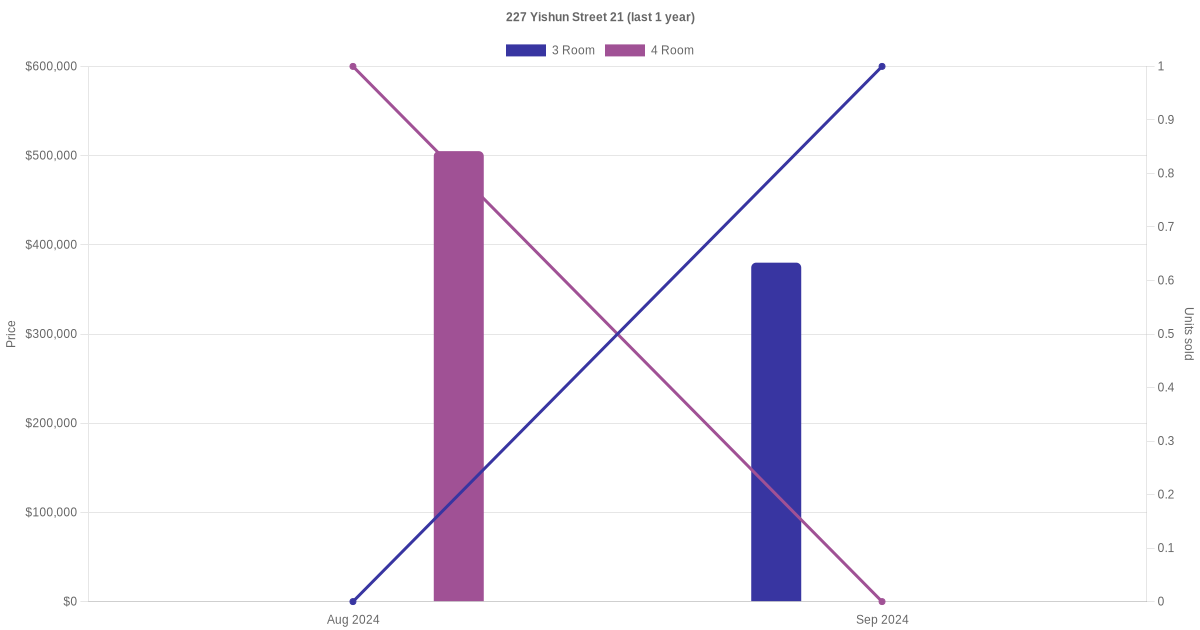 Below is a quick summary of the resale transactions volume and average price trends for the 3 room and 4 room units at 227 Yishun Street 21.