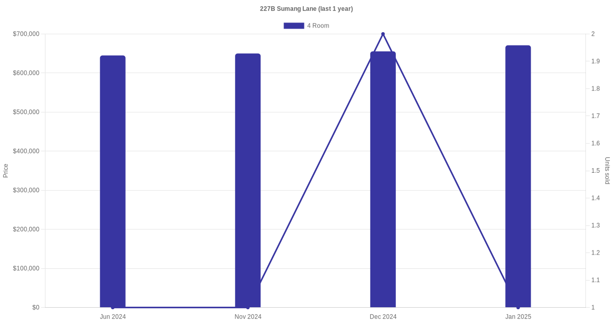 Below is a quick summary of the resale transactions volume and average price trends for the 4 room and 5 room units at 227B Sumang Lane.
