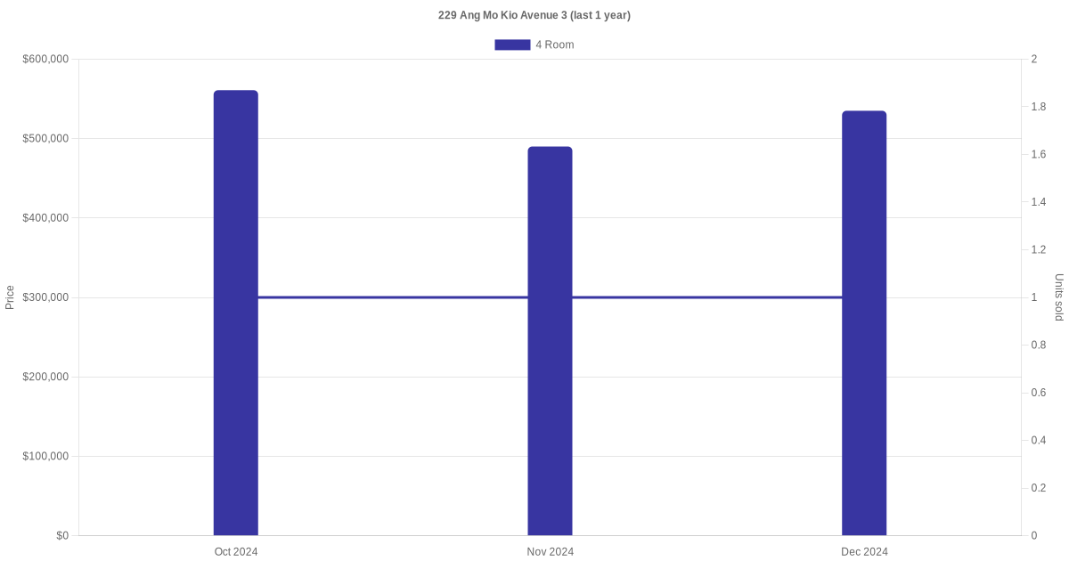 Below is a quick summary of the resale transactions volume and average price trends for the 4 room units at 229 Ang Mo Kio Avenue 3.