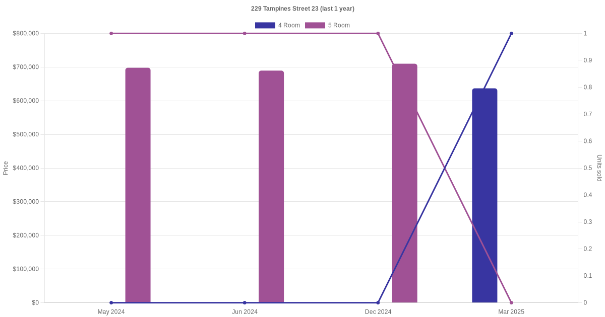 Below is a quick summary of the resale transactions volume and average price trends for the 4 room and 5 room units at 229 Tampines Street 23.