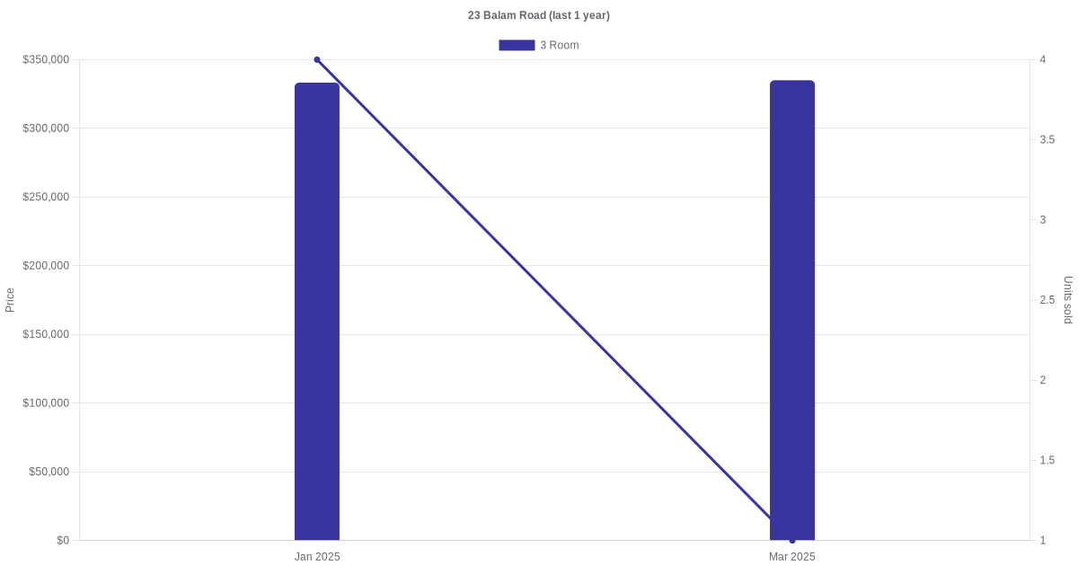 Below is a quick summary of the resale transactions volume and average price trends for the 3 room units at 23 Balam Road.